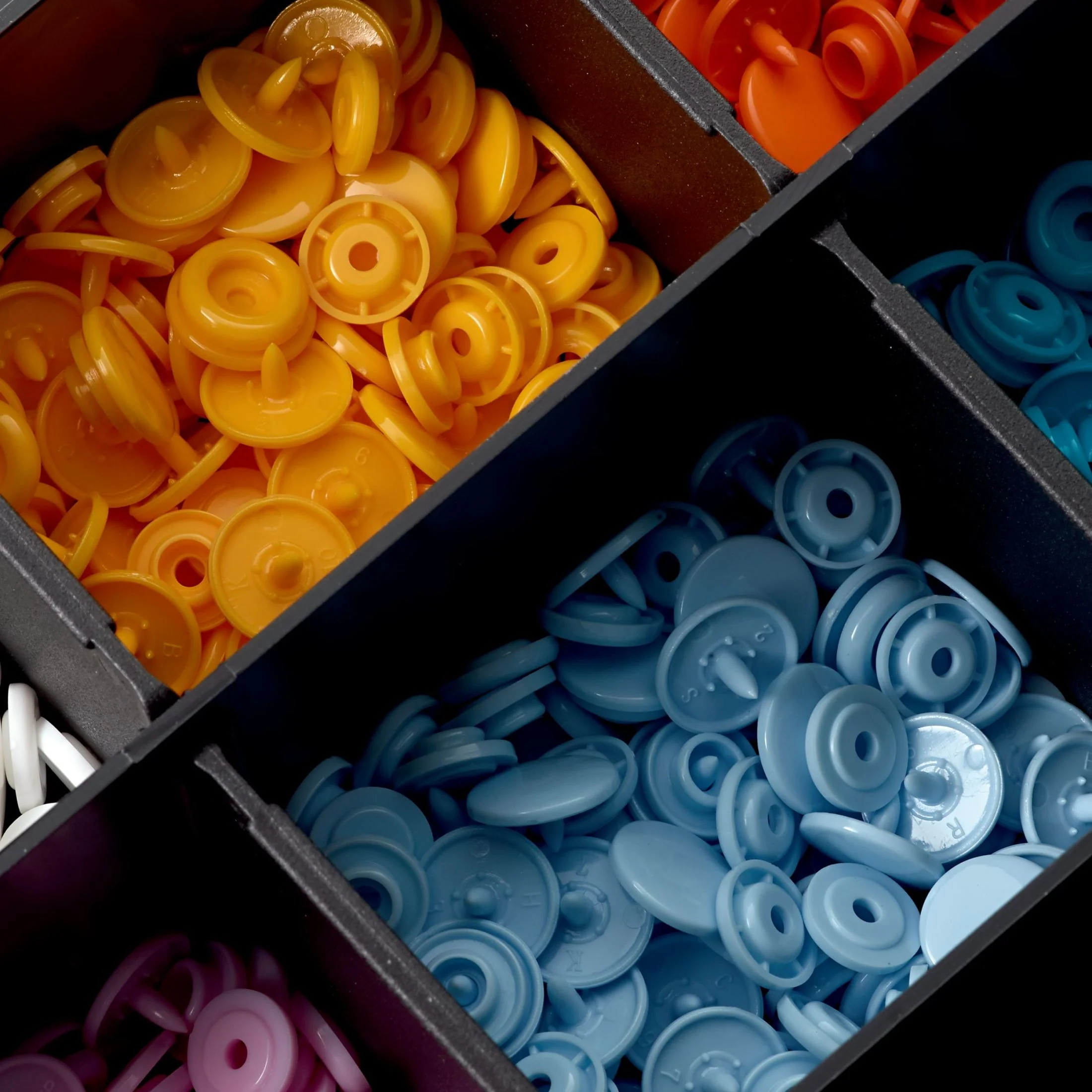 Perfect for sewing enthusiasts who like to be neat and tidy: With the Color Snaps Box, these popular snaps for decorating jackets, childrenâs clothes, accessories and more will be right at hand! The Color Snaps box contains 300 Color Snaps with easy fastening strength in the following 10 cheerful colors: white, yellow, orange, red, pink, pink, light blue, turquoise, apple green and black, and a âColor Snapsâ Tool kit. The spare compartments of the practical storage box can be used for other items or accessories. The Prym VARIO pliers or VARIO Creative Tool is required to apply the Color Snaps.